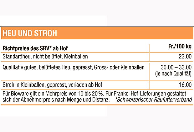 Die Mitglieder des SRV einigten sich daraufhin, den unverbindlichen Richtpreis für unbelüftetes Heu, gepresst und verladen, ab Hof, auf dem letztjährigen Niveau von 30 bis 33 Fr./100 kg zu belassen.