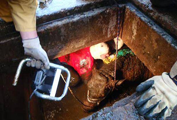 Das trächtige Rind musste durch eine sehr enge Schachtöffnung - 52 auf 71 Zentimeter – geborgen werden. Diese Unterfangen gestaltete sich als schwierige, mittels vereinten Kräften und der Hilfe eines Kranwagens konnte die junge Kuhdame nach rund einer Stunde aus ihrer misslichen Lage befreit werden.