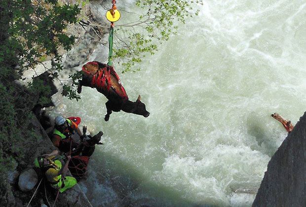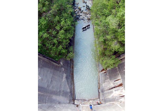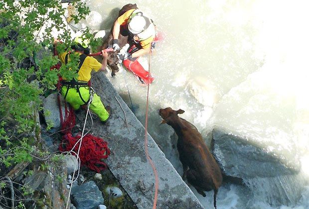 Einige Rinder fanden glücklicherweise an der Mauer des Damms sicheren Boden. Die anderen gerieten aber in ein schluchtartiges Gelände, weil sie einen Ausweg aus dem Bergbach suchten. Das Gelände ist aber nur schwer zugänglich. Die Lage der Rinder verschlechterte sich zunehmend. Schlussendlich konnten sich die Tiere weder vorwärts noch rückwärts bewegen. Einige Rinder suchten Schutz in höhlenartigen Unterspülungen, andere standen bis zum Hals im strömenden Wasser.