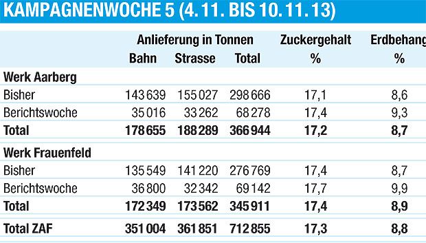 Bis und mit der sechsten Kampagnenwoche wurden in den beiden Werken in Aarberg und Frauenfeld etwas mehr als 700'000 Tonnen Rüben verarbeitet. Damit liegt die erste Halbzeit der Kampagne 2013 bereits zurück.