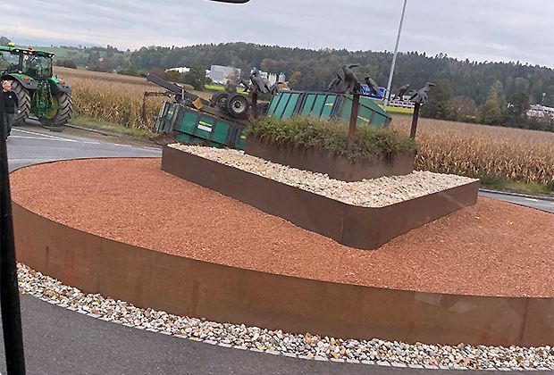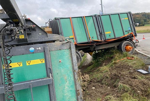 In der Region Bern kam es am Samstagmorgen zu einem spektakulären Verkehrsunfall. Zwei mit Zuckerrüben beladene Anhänger haben sich in einem Kreisel überschlagen. Verletzt wurde niemand.