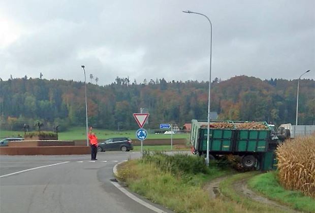 Gemäss bernerzeitung.ch befuhr ein Traktor mit zwei angekoppelten Anhängern kurz vor 9 Uhr einen Kreisel in Lätti. Aus noch unbekannten Gründen kippten die beiden Anhänger um.