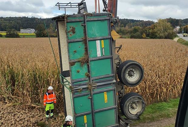 Die Zuckerrüben verteilten sich auf dem angrenzenden Feld. Die Bergung gestaltete sich anspruchsvoll. Mit einem Kran wurden die Anhänger zurück auf die Strasse gehievt. Dies dauerte mehrere Stunden. Gegen 13.30 Uhr konnte die Strasse wieder freigegeben werden.