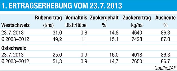 Nicht unerwartet muss von einer unterdurchschnittlichen Ernte 2013 ausgegangen werden. Wie hoch sie schlussendlich ausfällt und welche Zuckermenge daraus gewonnen werden kann, entscheidet der weitere Witterungsverlauf.