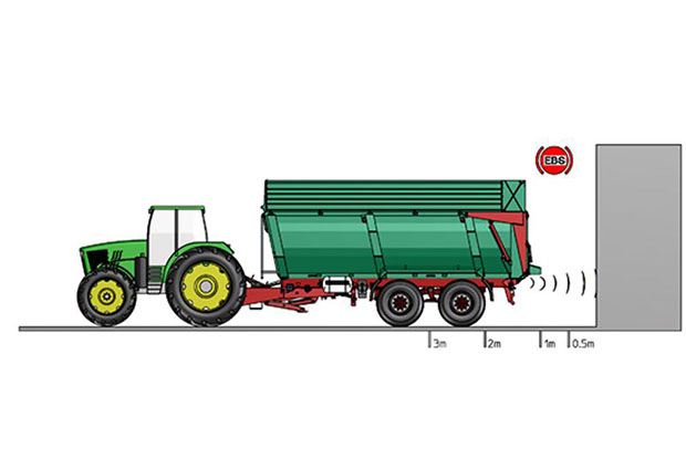 Verringert sich bei Rückwärtsfahrt des Kippers der freie Abstand auf weniger als drei Meter, wird der Fahrer durch Blinkzeichen an den seitlichen Begrenzungsleuchten gewarnt. Gleichzeitig ertönt ein Warnton und signalisiert die drohende Kollision. Wird der Abstand noch weiter verringert, steigt die Blinkfrequenz.