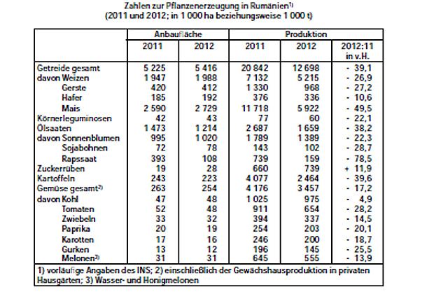 Die landwirtschaftlichen Betriebe in Rumänien haben im vergangenen Jahr aufgrund der Dürre deutlich weniger von den Feldern holen können als im Rekorderntejahr 2011. Das wird durch aktuelle Zahlen des Bukarester Statistikamtes (INS) zur Entwicklung der pflanzlichen Produktion des Landes bestätigt.