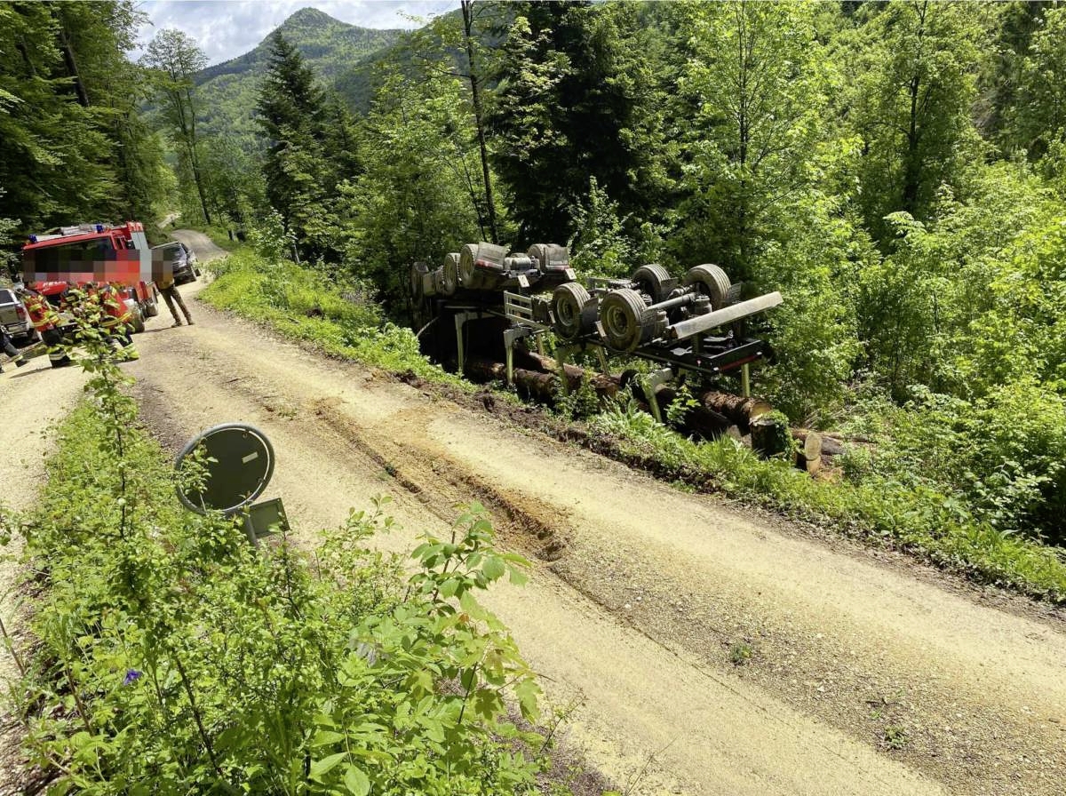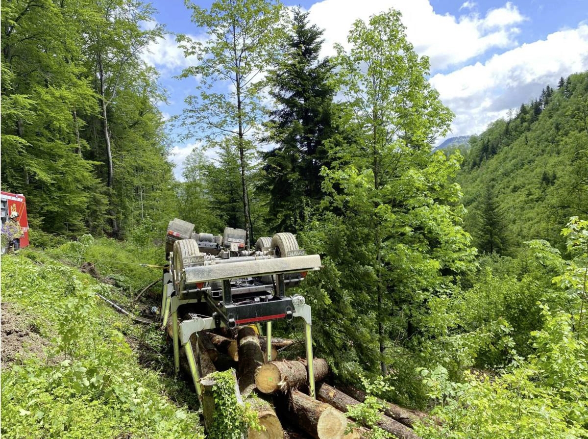 Gemäss Polizeiangaben war die Fahrzeugkombination gegen 11 Uhr auf einer Waldstrasse unterwegs. Vor der Einmünden in eine andere Strasse musste die Lastwagenfahrerin wegen einem talwärts fahrenden Auto anhalten.