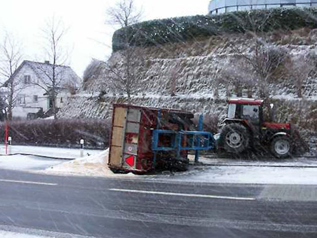 Bei schwierigen Strassenverhältnissen (schneebedeckte Fahrbahn) geriet der Traktor und der Anhänger ins Schleudern. Dieser kippte auf die Fahrbahn, das Zugfahrzeug kollidierte mit einem Baum am Strassenrand. Ein Teil des Sägemehls landete auf der Strasse. Personen kamen nicht zu Schaden.