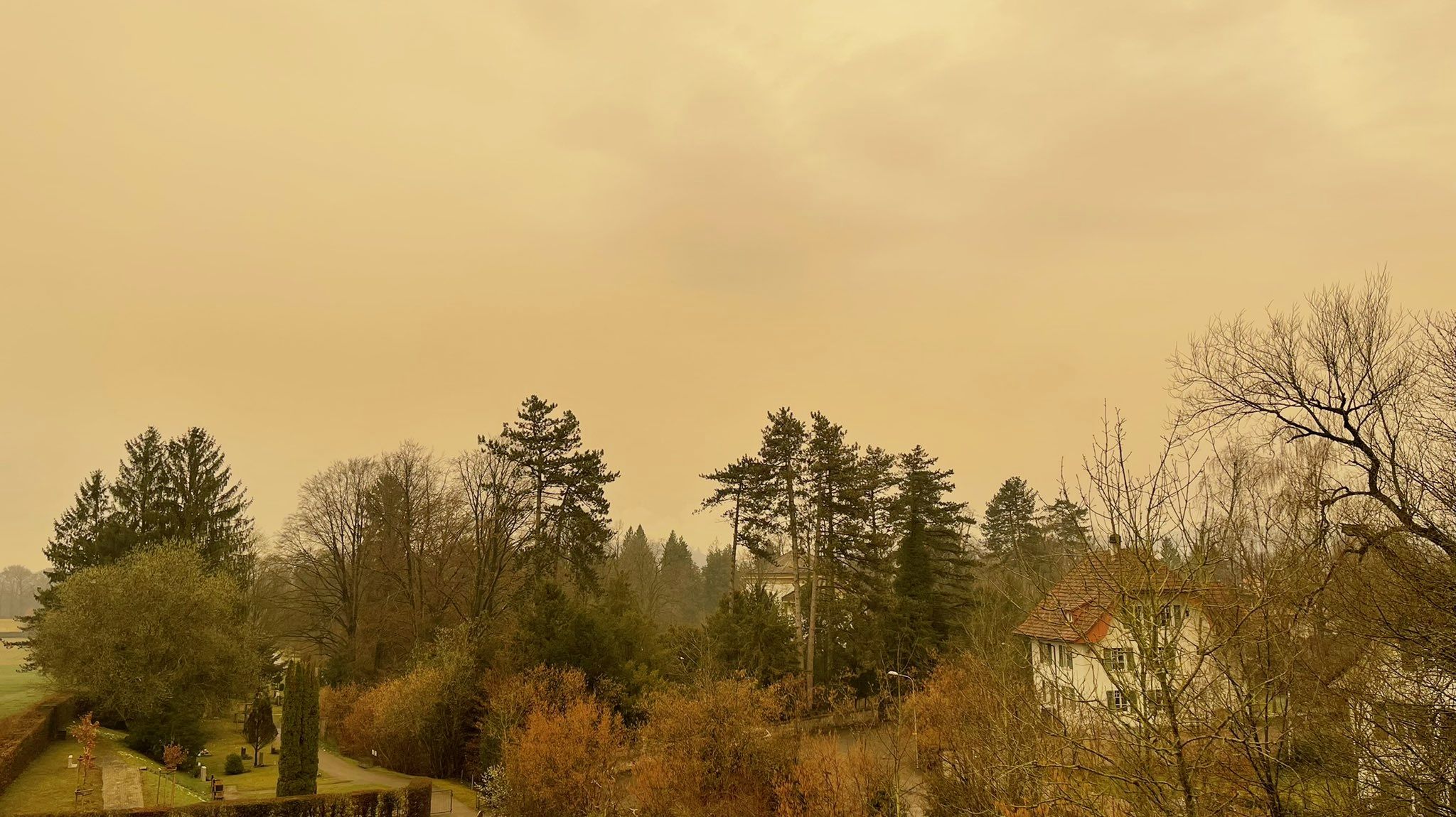 Die Sahara ist in der Schweiz angekommen, das ist der Grund für den gelben Himmel. Sehr milde Luft bringt in diesen März-Tagen Wüstenstaub bis in die Schweiz.