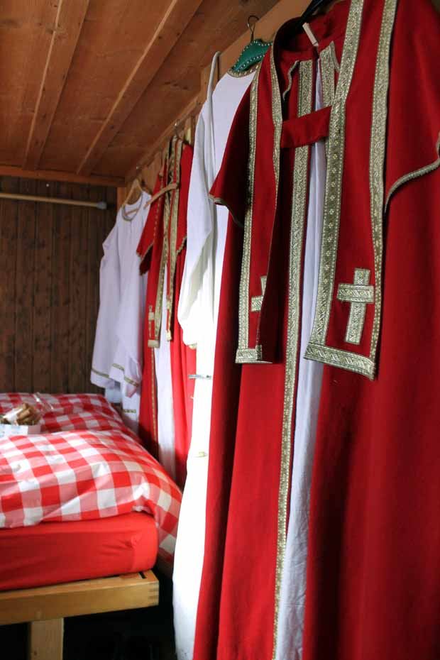 Während dem sich die durchgefrorenen Eltern am warmen «Gifferstee», mit Kaffee oder Kürbissuppe aufwärmen und mit frischer Züpfe, Brot, Guetzli, Nüssli und Bergkäse stärken, erkunden die Kinder Stall und Haus. Und zu sehen gibt es allerhand. Im Schlafzimmer eine rot-weiss karierte Bettdecke, der Bischofsstab und die roten Bischofsgewänder für besondere Anlässe hängen an der Wand, Mitras sind auf der Kommode einsatzbereit.