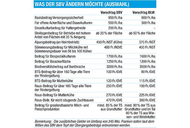 Unzufrieden ist der Verband zudem mit dem Kürzungsvorschlag des BLW. Das Amt will die Beiträge ab der 60sten Hektare kürzen, der SBV erst ab der 70sten. Und der SBV will Direktzahlungen ab der 150sten Hektare komplett streichen, das BLW schon ab der 140sten. Heute gibt es übrigens ab der 130sten Hektare keine Beiträge mehr.