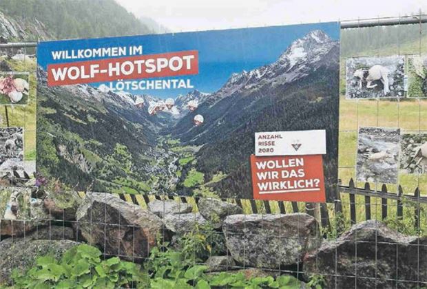 «Wollen wir das wirklich?» steht auf einer grossen Plakatwand auf einem Parkplatz im Lötschental geschrieben, schreibt der «Walliser Bote». Darunter zu sehen: ein Panoramabild des Lötschentals mit Angabe der genauen Standorte von diesjährigen Wolfrissen und Bilder von gerissenen Schafen. 44 tote Schafe habe der Wolf in diesem Jahr bereits gerissen, einige verletzte Tiere seien noch in tierärztlicher Behandlung, sagt Wildhüter Richard Bellwald laut der Lokalzeitung.