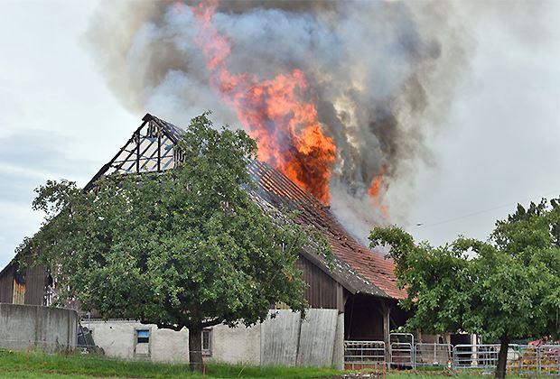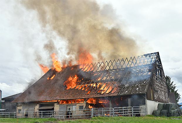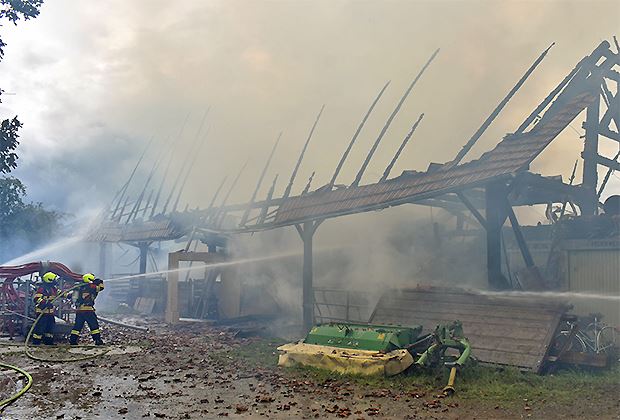 Das Feuer machte mit der mächtigen Scheune kurzen Prozess. Denn als die Einsatzkräfte gegen 16 Uhr am Brandort eintraf, stand ein Teil der Scheune bereits in Vollbrand. Die Tiere, die in der Scheune untergebracht sind, befanden sich bei Brandausbruch auf der Weide.