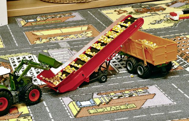 Früher, da mussten die heutigen Väter bei Spielzeug-Förderbändern noch von Hand kurbeln. Beim Förderband von Siku erfolgt der Antrieb mit zwei Batterien des Typs AAA. Nur der An-Aus-Schalter muss aktiviert werden, und schon gehts los. Probiert haben wir zu Hause Maiskörner von der letzten Ernte. Das ging problemlos. Dies auch, weil das Förderband eine Breite von über 4 cm hat und in der Höhe mehrstufig verstellbar ist.