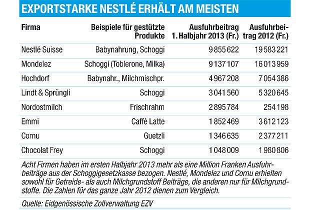 Beim Schoggigesetz ist manches anders, als man denkt. Vom Gesetz profitiert zum Beispiel nicht nur die Schoggiindustrie, sondern auch Milchverarbeiter wie Hochdorf und Emmi. In der Auflistung der grössten Beitragsbezüger des ersten Halbjahres 2013 steht mit fast drei Millionen Franken sogar ein bäuerliches Milchhandelsunternehmen an fünfter Stelle, die Nordostmilch.