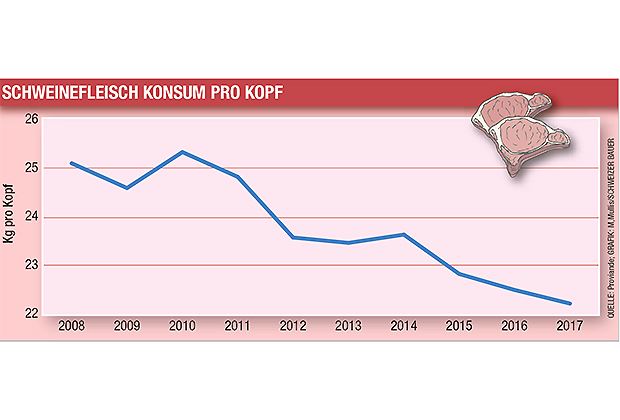 Gemäss den Zahlen von Proviande ist der Fleischkonsum insgesamt rückläufig, wobei der Pro-Kopf-Konsum beim Schweinefleisch insgesamt mit lediglich 0,4 Prozent den geringsten Rückgang verzeichnete. Nicht miteingerechnet sind dabei die Einkäufe, die von Schweizern im Ausland getätigt wurden.