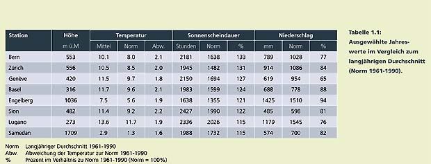 In der Westschweiz fielen über das ganze Jahr nur 65 bis 85 Prozent der Niederschlagsmengen im Vergleich zum Normwert zwischen 1961 und 1990. In der übrigen Schweiz lagen die Mengen meist zwischen 75 und 100 Prozent. Im Kontrast dazu gab es im September ausserordentlich viel Regen und in höheren Lagen grosse Schneemengen. Danach aber schneite es erst wieder im Dezember richtig.