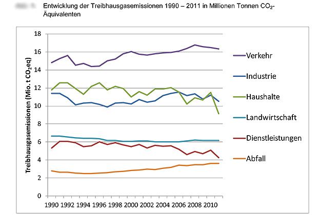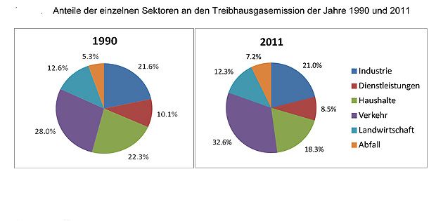 Seit 1990 abgenommen hat der Ausstoss der Sektoren Dienstleistungen (minus 21 Prozent), Haushalte (minus 22 Prozent) und Industrie (minus 8 Prozent). Diese drei Sektoren zeigen wegen der warmen Temperaturen in der Heizperiode ausgeprägte Abnahmen zwischen 2010 und 2011. Zusammen sind sie für knapp die Hälfte der Treibhausgasemissionen verantwortlich.