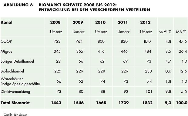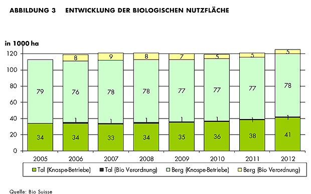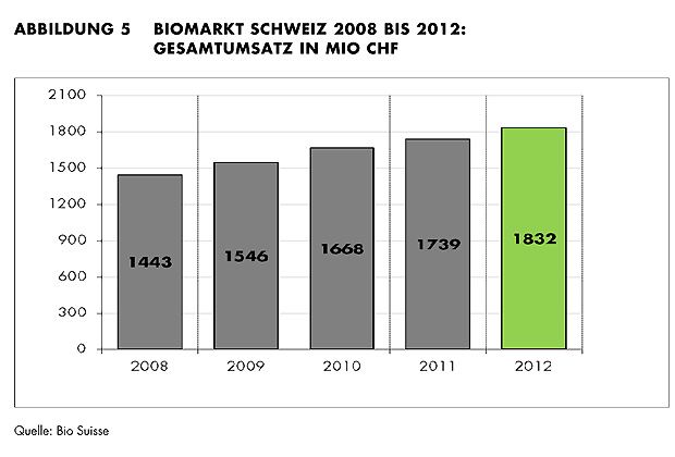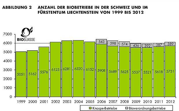 Wieder mehr Bauern wenden sich der Bio-Landwirtschaft zu. 115 Betriebe mehr als 2011 bewirtschaften ihren Hof nach Biorichtlinien. 11,3 Prozent aller Landwirtschaftsbetriebe produzierten letztes Jahr biologisch. Der Detailhandel erzielte einen Gesamtumsatz von 1,83 Milliarden Franken, 5,3 Prozent mehr als im Vorjahr.