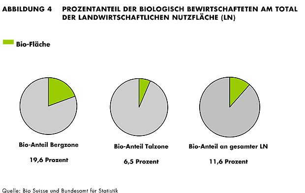 Insgesamt produzierten im Berichtsjahr 6120 Betriebe nach den Richtlinien von Bio Suisse (5731) oder der Bioverordnung des Bundes (389). Am meisten Bio-Höfe und den höchsten prozentualen Anteil gab es mit 1293 von 2355 Betrieben (54,9 Prozent) im Kanton Graubünden. Im Kanton Bern gibt es zwar mit 1131 fast gleich viele, sie machen aber von den über 11'000 Betrieben nur 10,2 Prozent aus.