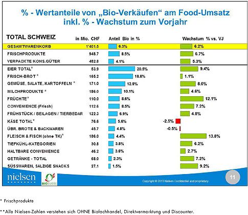 Zugelegt hat der Biomarkt laut Bio Suisse auch im Detailhandel. Hier stieg der Gesamtumsatz um 5,3 Prozent auf 1,83 Milliarden Franken. Der Marktanteil von Bioprodukten sei damit von 6 auf 6,3 Prozent angewachsen, sagte Bio-Suisse-Marketingchef Jürg Schenkel. Abgesehen von Brot- und Backwaren sowie Käse hätten alle Produktegruppen zulegen können. Nach wie vor am beliebtesten seien Eier mit einem Marktanteil von gut 20,5 Prozent.