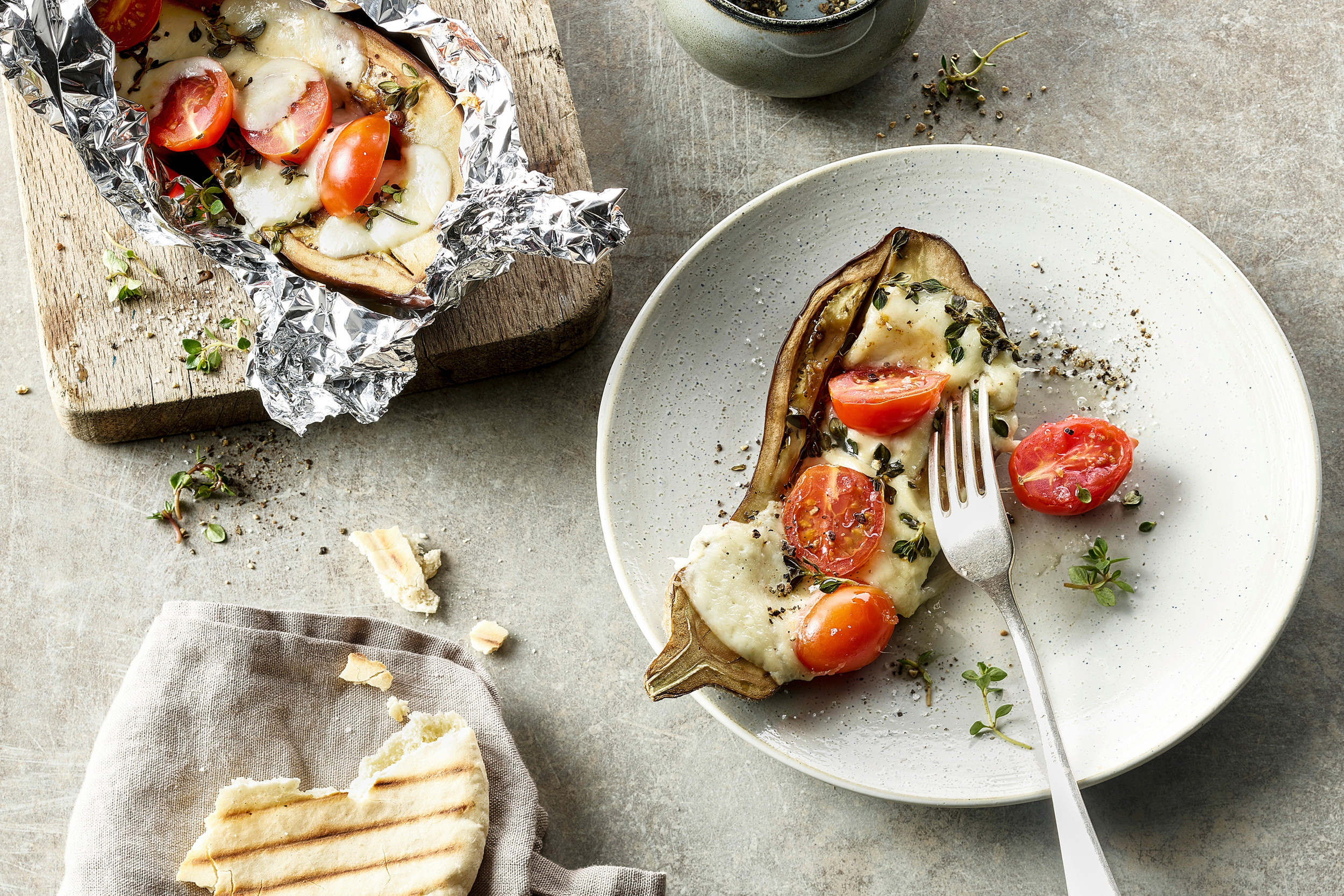 Grillierte Aubergine mit Mozzarella, der Käse findet in der Küche seinen verdienten Platz.
