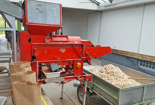 Die Ernte der Kolben erfolgte von Hand. Die Kolben wurden anschliessend noch nachgetrocknet und die Körner dann mit einer stationären Dreschmaschine abgelöst. Die Ernte wäre aber auch mit einem normalen Mähdrescher möglich. Wichtig ist beim Popcorn-Mais die Qualität der Körner: Diese dürfen nicht verletzt sein (nicht zu trocken dreschen). Allerdings können die Körner bei zu feuchtem Drusch an der Spindel brechen. sb