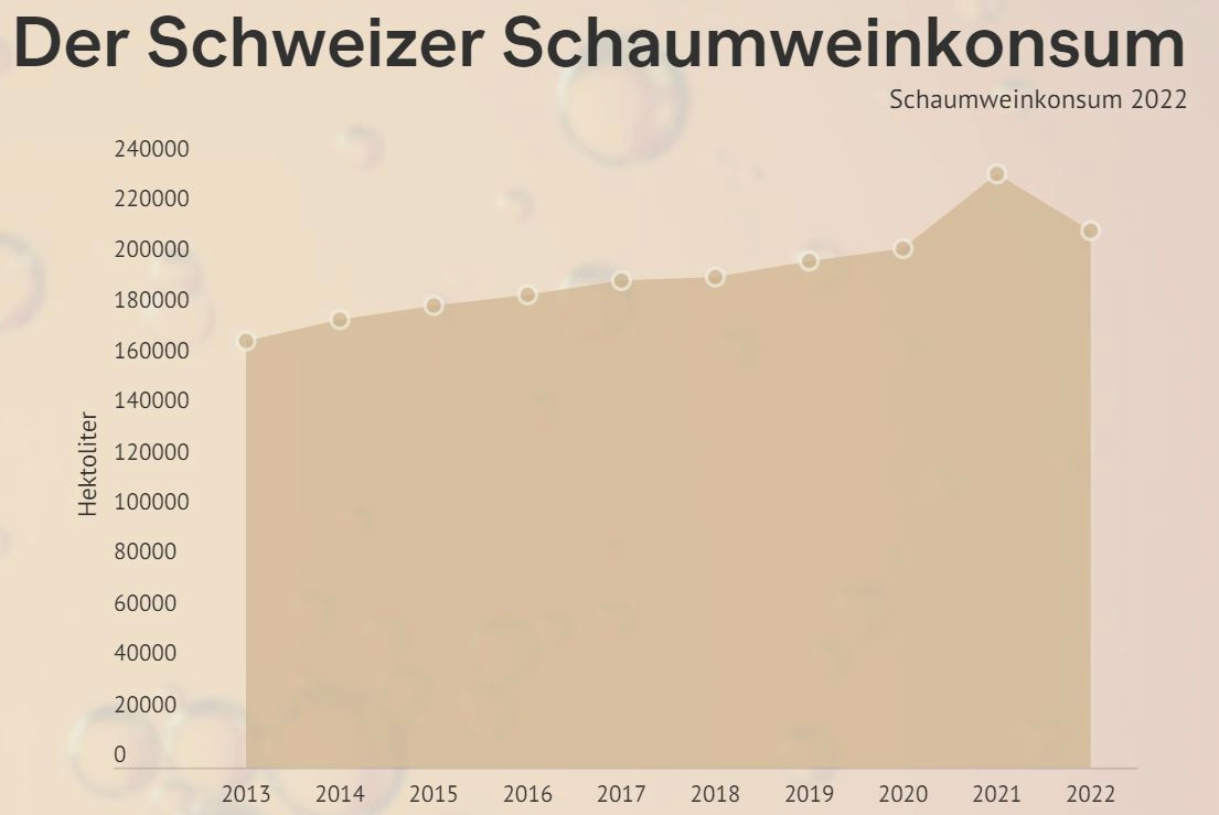 Schweizer Schaumwein ist derzeit eine Nische: 558'200 Liter Schweizer Schaumwein wurden 2022 konsumiert. Das Bundesamt für Landwirtschaft erfasste den Konsum im vergangenen Jahr zum ersten Mal. Zum Vergleich: Der Gesamtkonsum von Schweizer Wein lag bei 87,7 Millionen Liter.