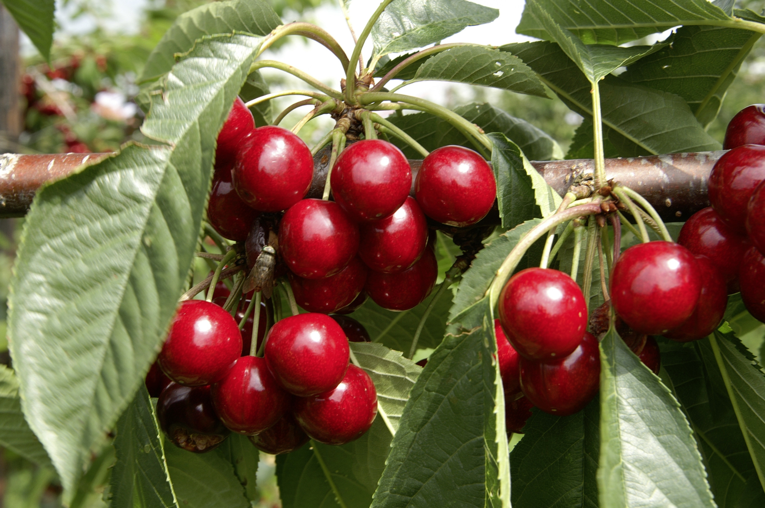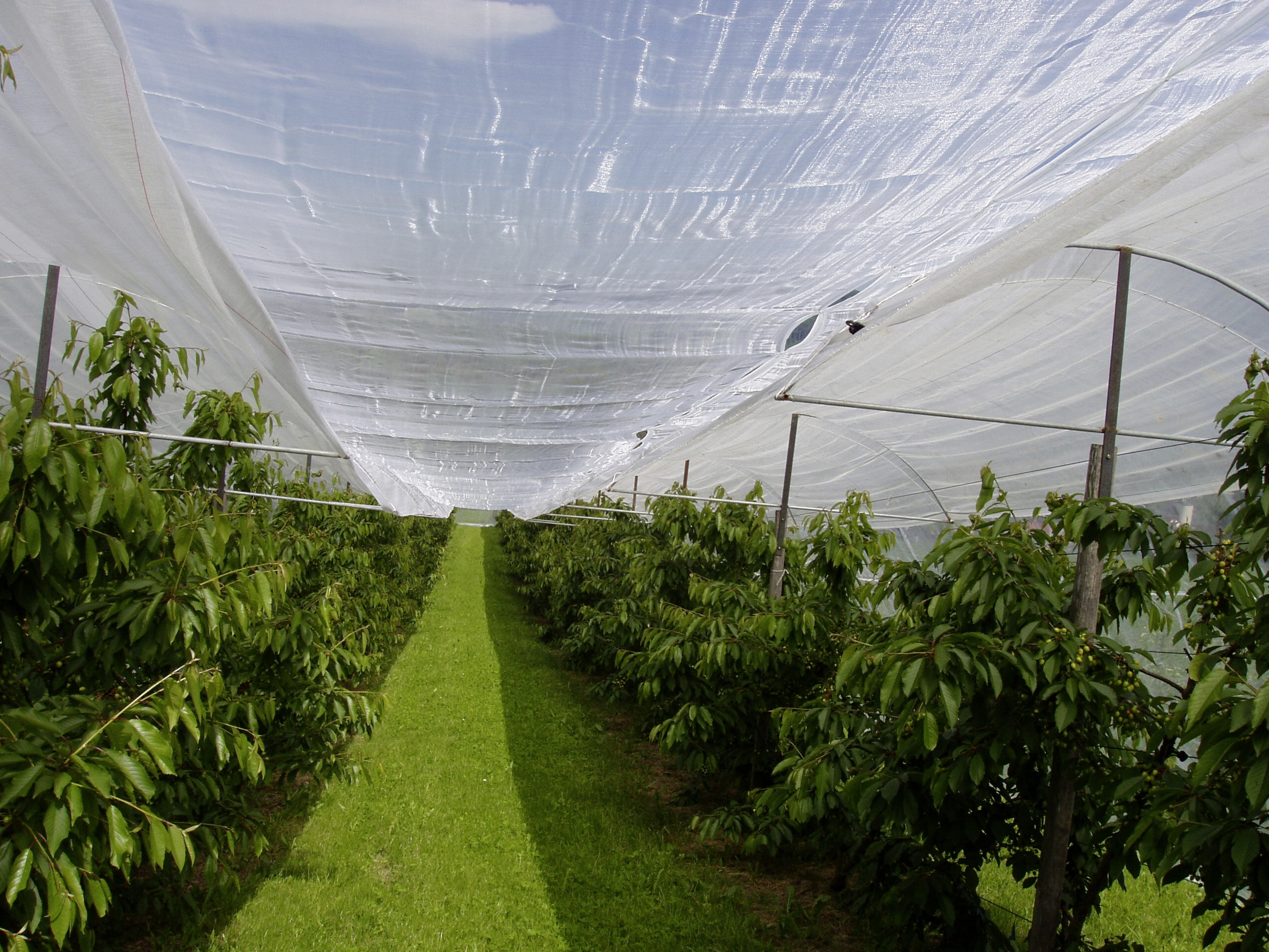 Durch die Abdeckung der Kirschenkulturen mit Regenschutzfolien können die knackigen Tafelkirschensorten vor dem Aufplatzen bei grossen Regenfällen geschützt werden. Die feinmaschigen Seitennetze erschweren Schädlingen wie der Kirschessigfliege und der Kirschenfliege den Zugang zu den süssen Früchten.