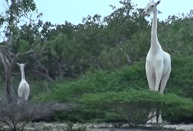 Es gibt nur wenige weisse Giraffen in Kenia und sie werden selten gesichtet. Forscher vermuten, dass sie unter einer Defekt-Mutation namens Leuzismus leiden. Diese führt bei Tieren dazu, dass Fell und Federn weiss und die darunterliegende Haut rosa sind, weil die Haut keine Melanozyten, also farbstoffbildende Zellen, enthält.