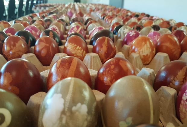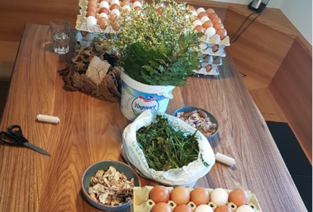 Ende Februar, Anfang März – je nach Datum des Feiertags – beginnt das Einpacken. Einmal die Woche, meist ist es ein Samstag, trudeln um neun, sobald die Arbeit im Stall erledigt ist, die Helfer ein. Schwiegereltern, Onkel, Bekannte, Freunde – alle helfen mit. Auf dem Tisch in der Küche liegen Strümpfe und Grünzeug, und irgendwo dazwischen Röllchen mit Faden. Jeder schnappt sich ein Ei – dann gehts los. Eine Handvoll Gräser auf den dünnen Stoff, Ei rein, Deckel drauf – oder anders gesagt; den Strumpfstummel oben mit Faden umwickeln. Andere befeuchten das Ei mit Wasser und setzen ihm jedes Pflänzchen einzeln auf. Funktionieren tut beides – Hauptsache, man ist kreativ. Auch Sujets aus Papier kommen zum Zug. Kleine Hasen, Vögel oder Herzchen – zwischendurch greift jemand zum Zahnstocher, um die beim Einbinden verschobenen Papiertierchen unter dem Strumpf zurechtzurücken.