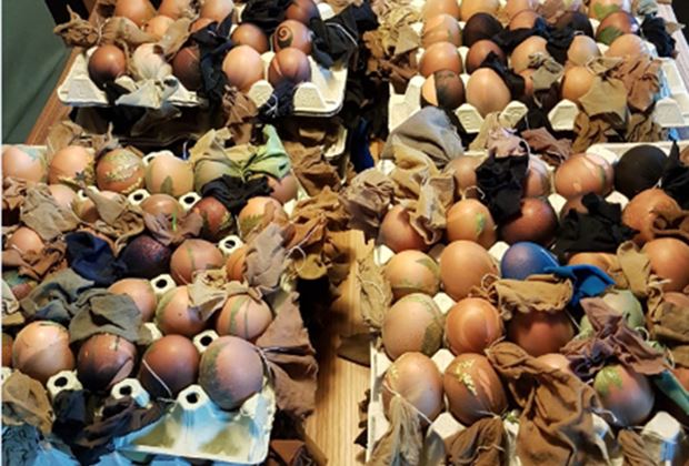 Abschrecken? Nein danke. Der Kalt-Wasser-Schock führt zu Rissen in der Schale. Haldemanns lassen die Eier auskühlen. Noch warm reiben sie diese mit einer Art Gellack ein. So stellen sie die Schutzschicht, die durchs Kochen im Wasser verloren geht, wieder her. Sie macht die Eier länger haltbar. Bis zu vier Wochen bleiben die schaligen Farbkugeln frisch.