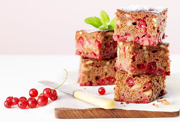 Zutaten für eine Backform von 25x25 cm: 100 g dunkle Schokolade; 100 g weisse Schokolade; 120 g Butter; 100 g Mandelsplitter; 4 Eier; 100 g Zucker; 1 Päckli Vanillezucker; 1 Prise Salz; nach Belieben 1 Msp. Chilipulver; 180 g Mehl; 2 TL Backpulver; 500 g Johannisbeeren; Puderzucker zum Bestäuben.