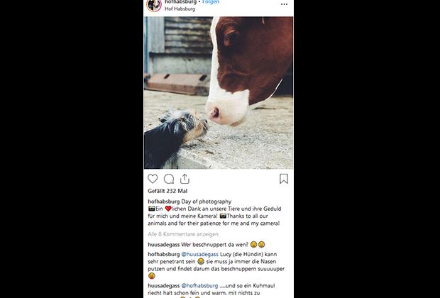 Marina Boller ist seit August 2016 auf Instagram aktiv. Sie veröffentlicht dort unter "hofhabsburg" vor allem eines: Fotos von ihren Kühen – aufgenommen von unten, von oben, schräg von der Seite, auf der Weide, im Laufstall, im Melkstand. Mal sind es Nahaufnahmen eines Kuhrückens oder eines Kuhmauls, mal ein neugeborenes Kalb, mal eine Kuh, die mit ihrer Zunge die Nasenlöcher poliert.