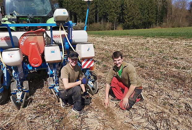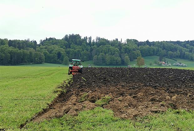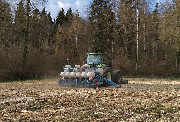 Vielerorts wird Mais gesät. Die meisten Landwirte pflügen das Feld und bringen so Boden aus etwa 20 Zentimetern Tiefe an die Oberfläche. Danach lassen sie das Feld ein paar Stunden bis Tage abtrocknen und bereiten mit der Egge ein gleichmässiges Saatbett vor. Eine andere, beliebte Variante ist die Aussaat in ein gegrubbertes Feld. Dabei wird der Boden nicht gewendet, aber das Gerät lockert die oberste Bodenschicht auf.