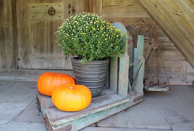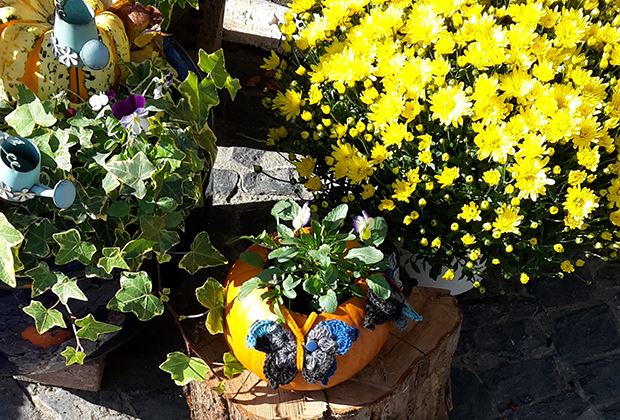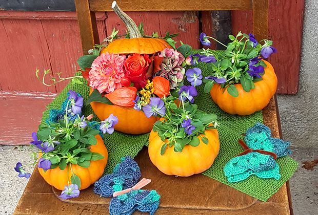 Gefüllte Kürbis mal anders: eine wahre Blumenpracht in Zierkürbisse eingepflanzt.