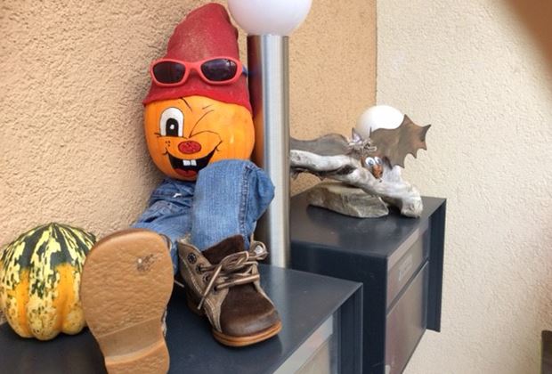 Lässig sitzt der Kürbis-Junge auf dem Briefkasten in Aeschi b.Spiez BE.