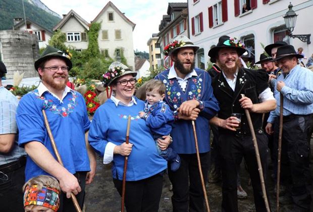 Eine gesellige Truppe: das Älplerteam Alp Walabütz nach dem Alpabzug auf dem Dorfplatz Mels SG.