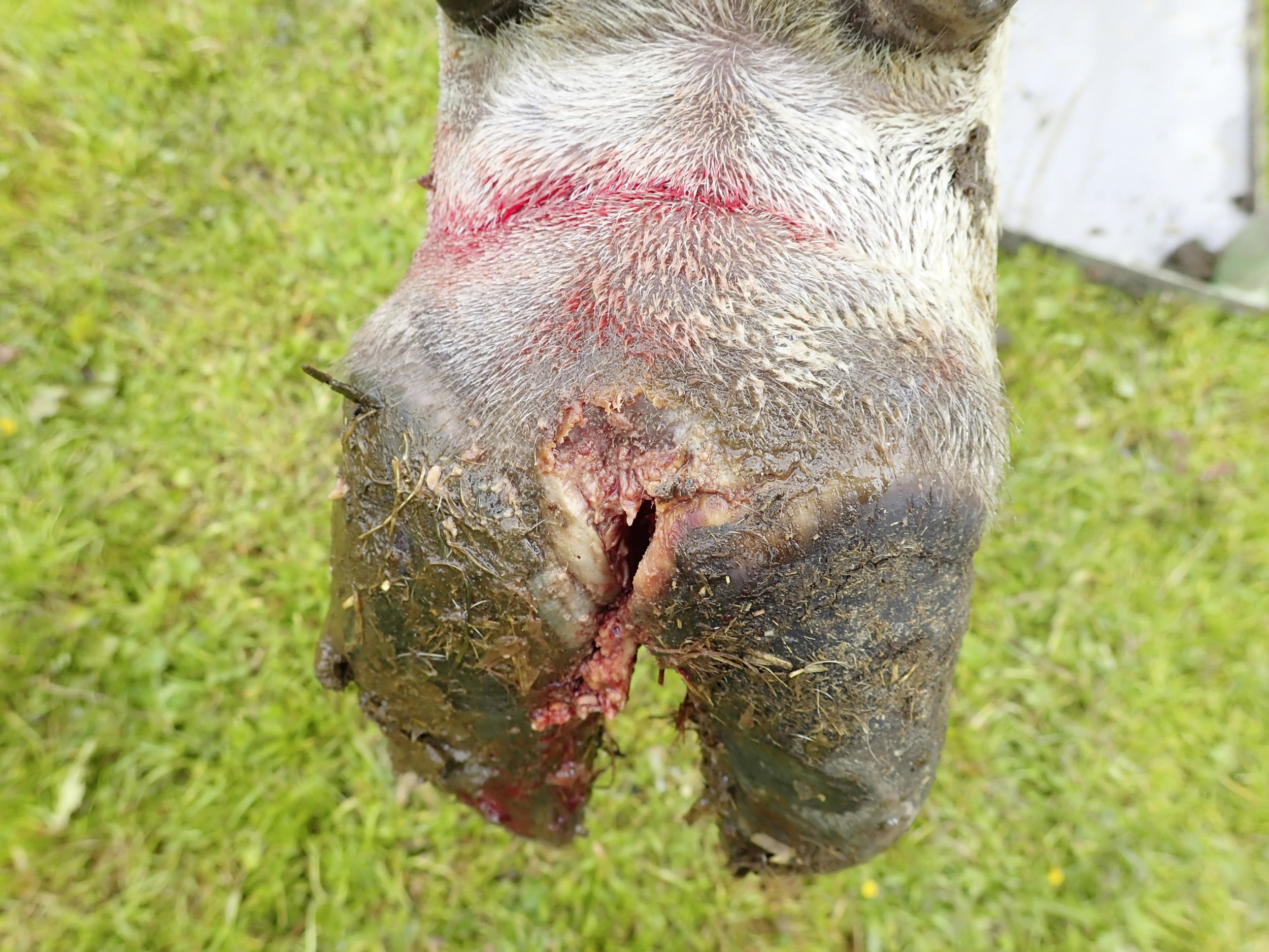 Symptome: Die «Schlegelfäule» tritt gehäuft an den Hinterbeinen auf. Das Tier entlastet ein Bein («lahmt») und eine Schwellung im Bereich des Kronsaums bis hin zur Fesselbeuge ist sichtbar. Die Tiere haben zum Teil Fieber und sind in ihrem Allgemeinbefinden gestört.