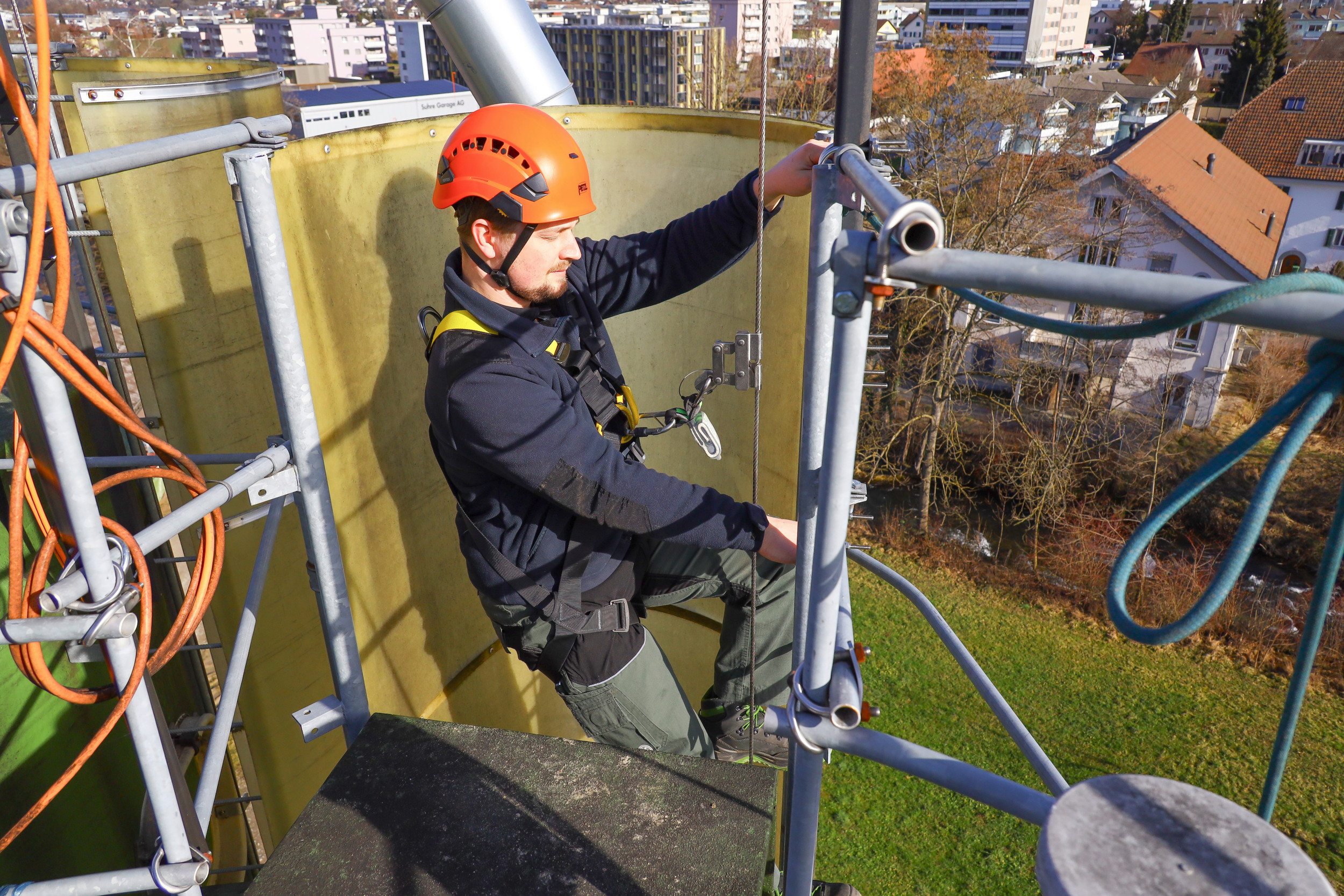 Absturzsicherung beim Auf- und Abstieg mit einer fest montierten, mitlaufenden Steigschutzeinrichtung.