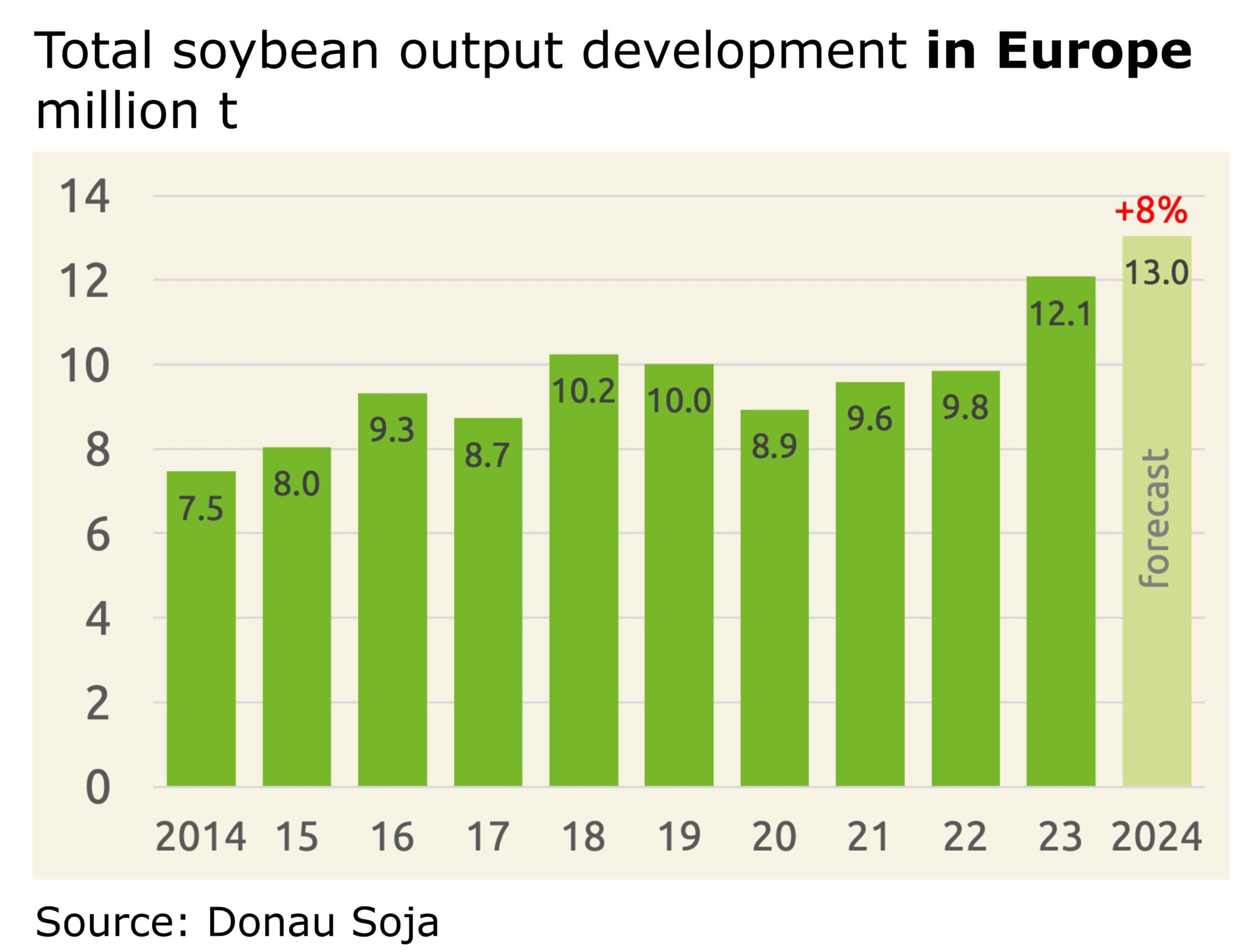 Gesamtentwicklung des Sojabohnenanbaus in Europa 2014-2024.