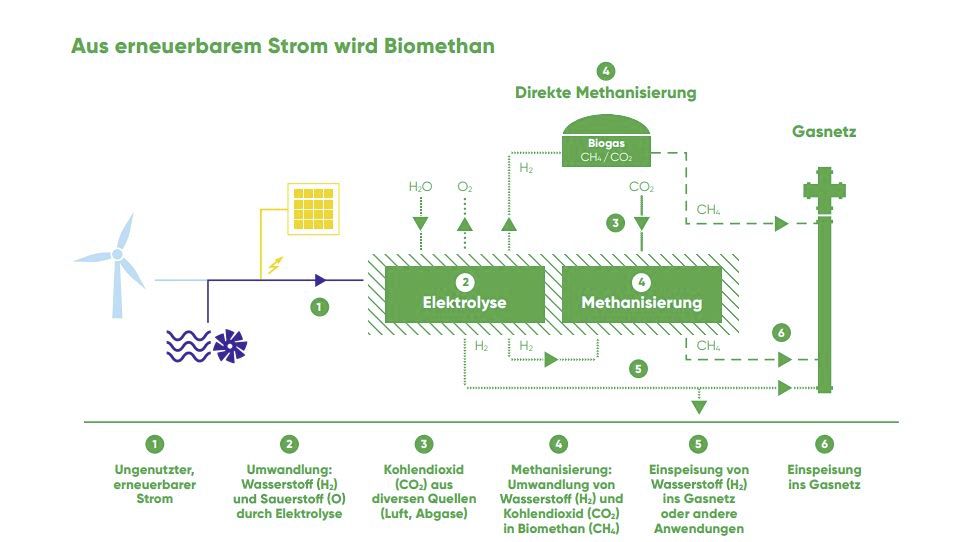 Sogenannte Power-to-Gas-Anlagen haben den Vorteil, dass sie CO2 aus der Luft absorbieren und es mit Wasserstoff, der aus Sonnenenergie hergestellt wird, binden. Am Ende dieses Prozesses entsteht Methan oder synthetisches Methanol, das gespeichert und für die Mobilität oder für andere Zwecke genutzt werden kann.