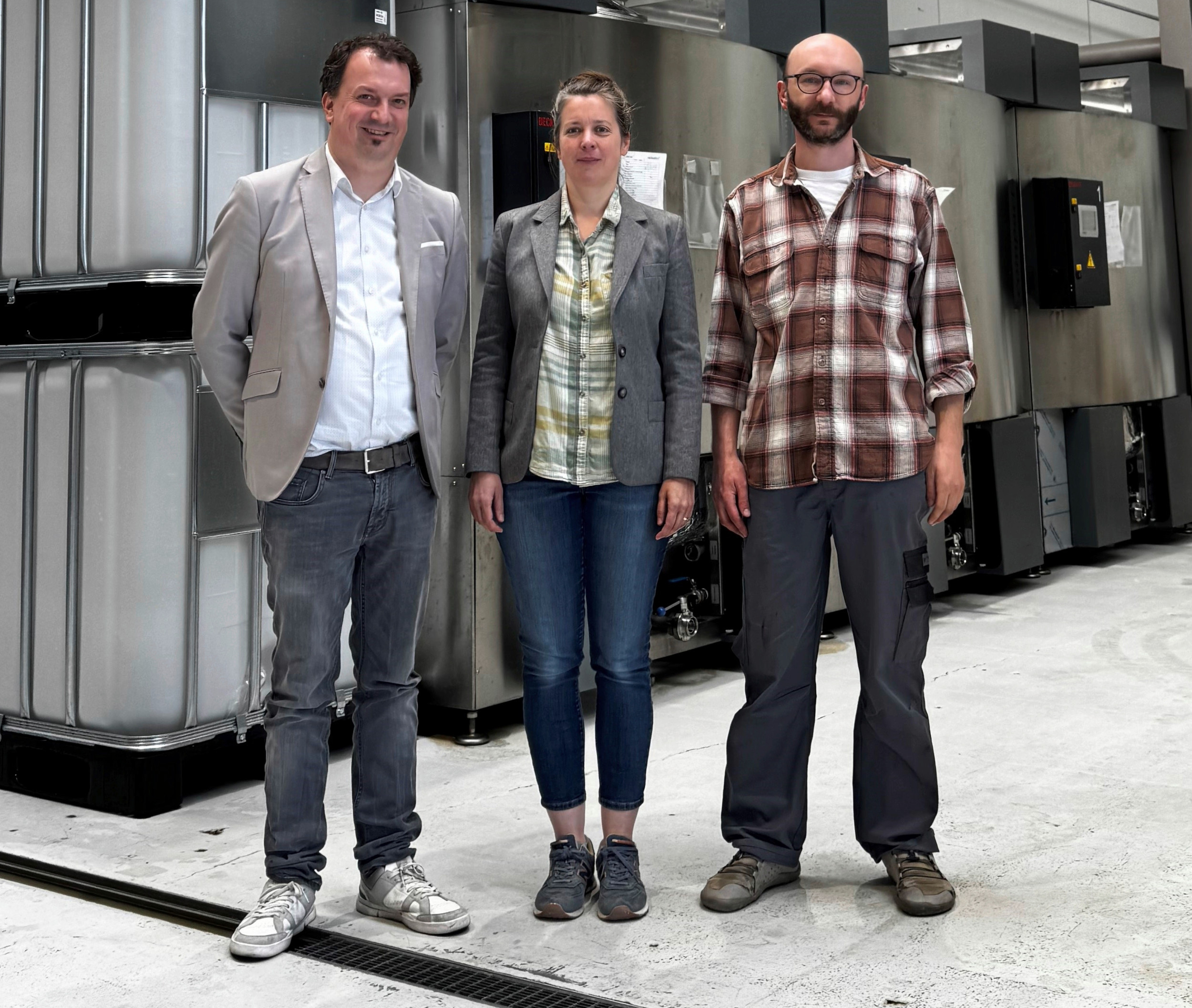 Geschäftsführender Verwaltungsrat Wolfgang Harreither, Verwaltungsrätin Katharina Steiner und Produktionsleiter William Bausman in der Produktion in Emmen LU. (v.l.).