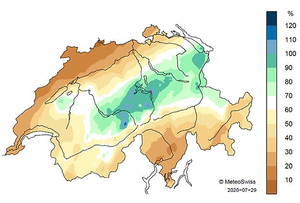 In der West- und Nordwestschweiz blieben die Werte bis am 28. Juli lokal unter 20 % der Norm 1981−2010. In Basel gab es bis am 28. Juli sogar nur gerade 5,6 mm oder 6% der Norm. Ohne weitere Niederschläge in den letzten Julitagen ist dies in Basel der niederschlagsärmste Juli seit Messbeginn 1864. Deutlich reichlicher fiel der Regen am zentralen und östlichen Alpennordhang mit 70 bis knapp 100% der Norm 1981−2010.