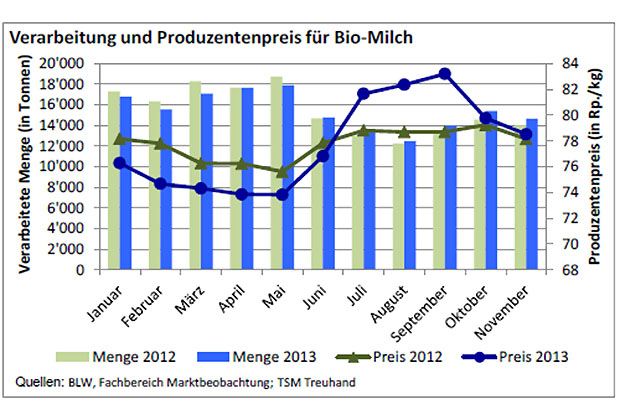 Das Jahr 2013 startete für die Biomilchproduzenten wenig erfreulich. Im Sommer hingegen kletterten die Preise deutlich über die Vorjahreswerte.