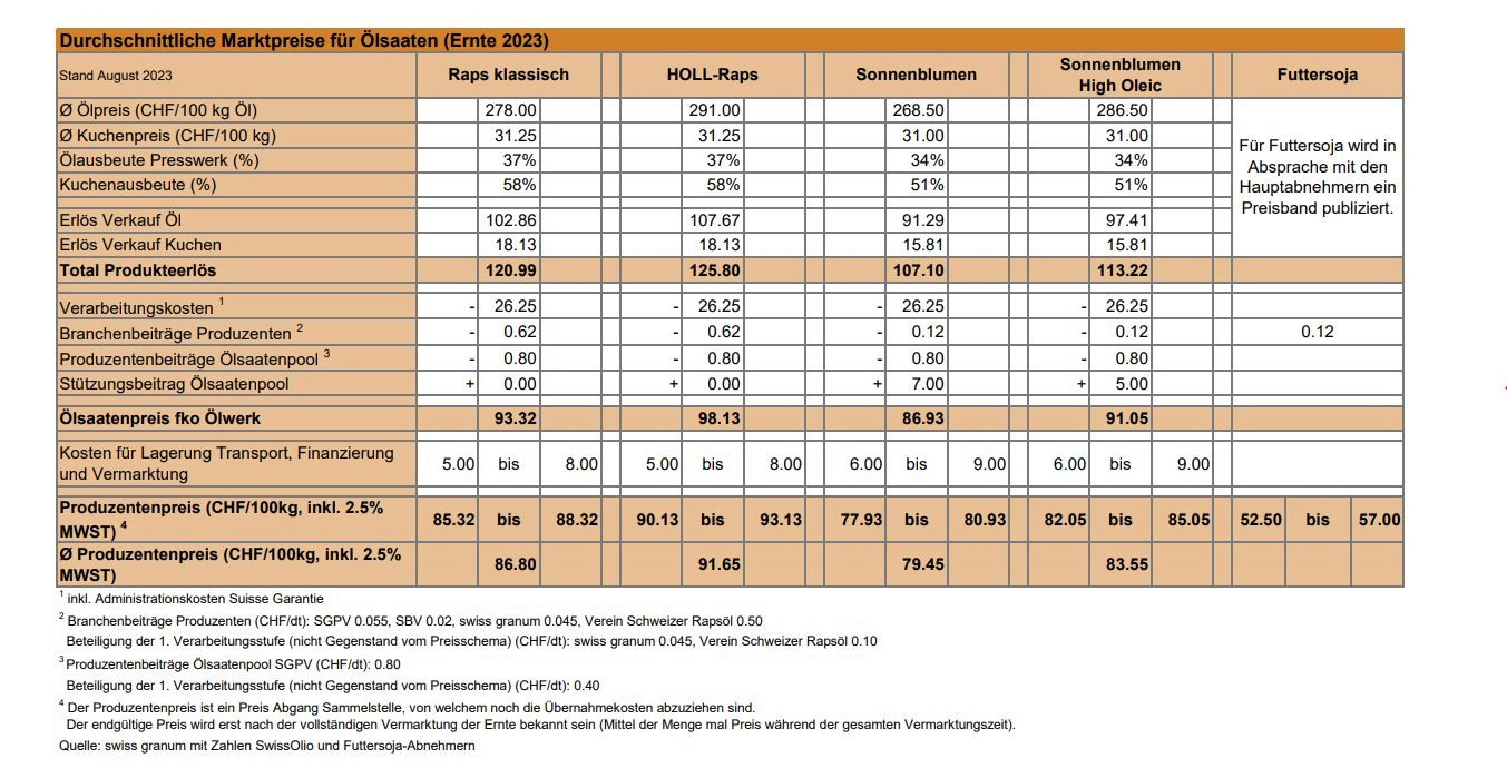Anders als beim Getreide handelt es sich bei den Ölsaaten nicht um einen Richtpreis. Der publizierte Preis ist ein kalkulierter, durchschnittlicher Marktpreis, der je nach Vermarktungszeitpunkt und der individuellen Kontrakte zwischen den Marktpartnern variieren kann.