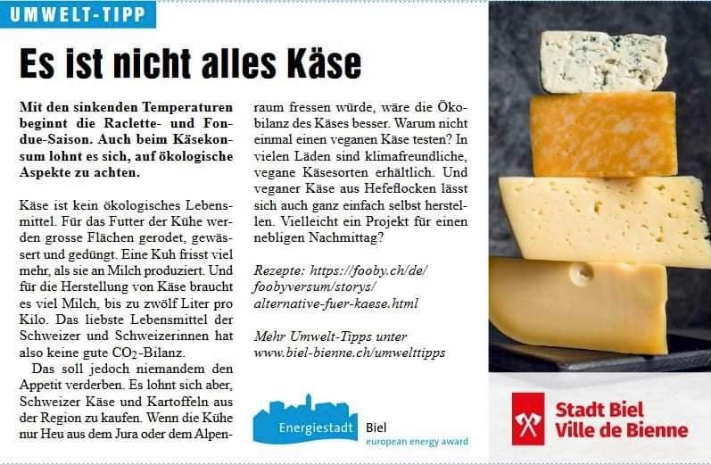 Mit seinen sogenannten Umwelttipps möchte die Stadt Biel seine Bevölkerung zu umwelt- und klimafreundlicherem Verhalten animieren. Normalerweise rät die Stadt bei solchen Tipps zur Verwendung von Mehrweggeschirr oder zum Recycling von PET-Flaschen. Doch jetzt hat die Stadt Biel den Vogel abgeschossen. Mit dem Umwelttipp «Es ist nicht alles Käse» wird dem Lebensmittel unterstellt, nicht ökologisch zu sein.