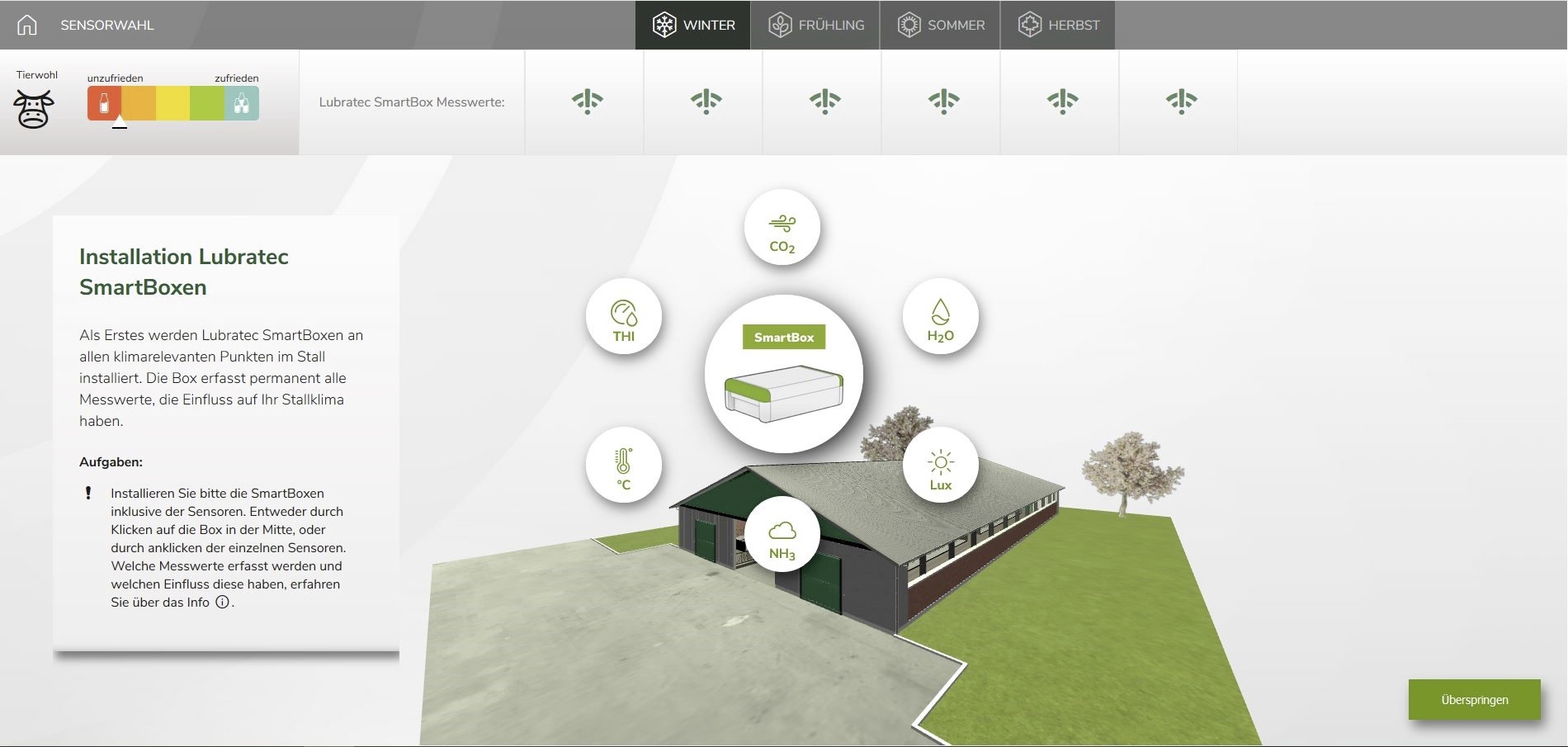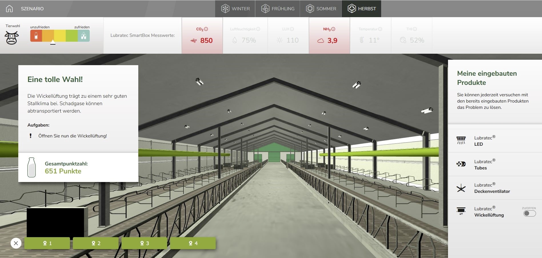 Beim Simulator muss sich der User in jeder Jahreszeit spielerisch einer Herausforderung stellen, beispielsweise Hitzestress oder hohem Schadgasanteil im Stallgebäude. Durch den Einbau und das anschliessende Einstellen der Belüftungs- und Belichtungsprodukte hat der User die Möglichkeit, das Stallklima zu verbessern und das Tierwohl zu steigern. Die Entscheide wirken sich durch Punkte aus. Am Ende bietet der Simulator die Möglichkeit, Freunde herauszufordern den eigenen Highscore zu knacken.