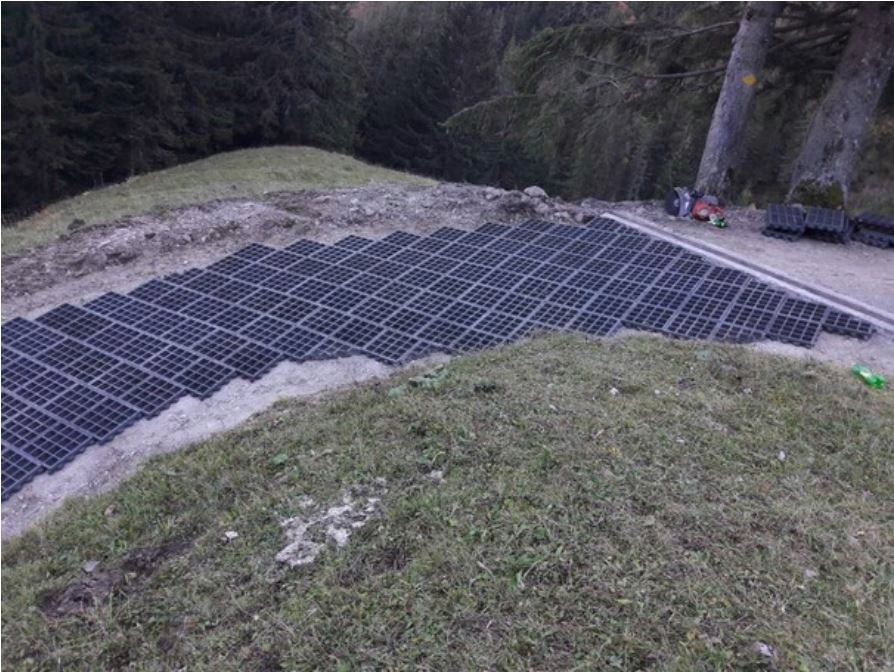 Die einzelnen Elemente greifen analog einem Puzzle ineinander. Dadurch werden die Scherkräfte vor allem in den Kurven besser und auf eine grössere Fläche verteilt. Da die Gitterstein-Elemente leicht sind, können sie mit kleinen Transportern zum Einbauort gefahren werden. Dort werden sie verlegt und mit Split verfüllt.