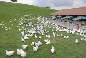 <figcaption>Coffee und Cream sind neue Zweinutzungshühnerrassen. Cream entsteht aus der Anpaarung der Rassen Bresse und White Rock und Coffee aus der Anpaarung der Rassen Bresse und New Hampshire. Die Cream ist eine weisse Henne mit weissem Hahn. Die Coffee ist eine bunte Truppe mit braunen, weissen und zum Teil auch schwarz-gemusterten Tieren.